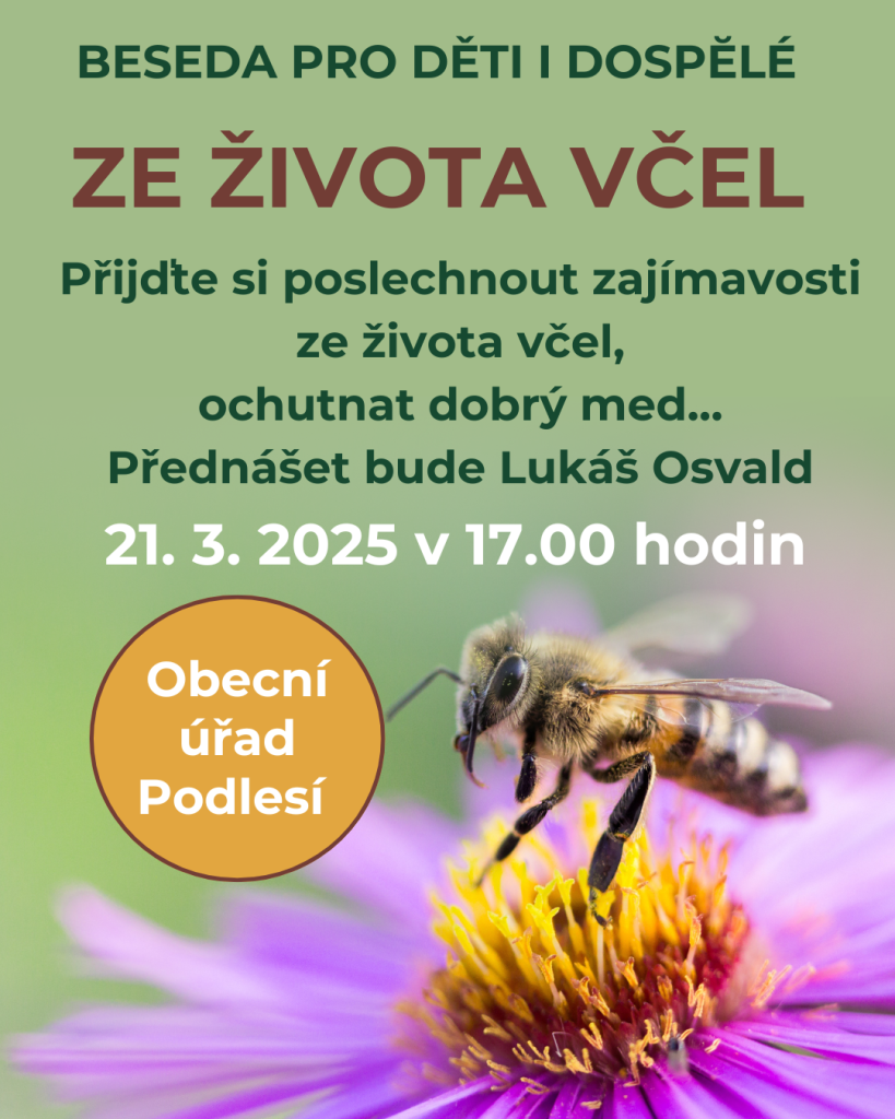 Všichni jste srdečně zváni na zajímavou besedu na téma: Ze života včel. Besedu povede Lukáš Osvald. Dozvíte se mnoho informací, uvidíte včelařské pomůcky a ochutnáte med.
