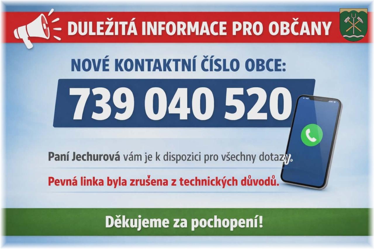 z technických důvodů byla zrušena pevná telefonní linka obce. Aby byl obecní úřad nadále dobře dostupný, využívejte nové kontaktní mobilní číslo: 739 040 520.