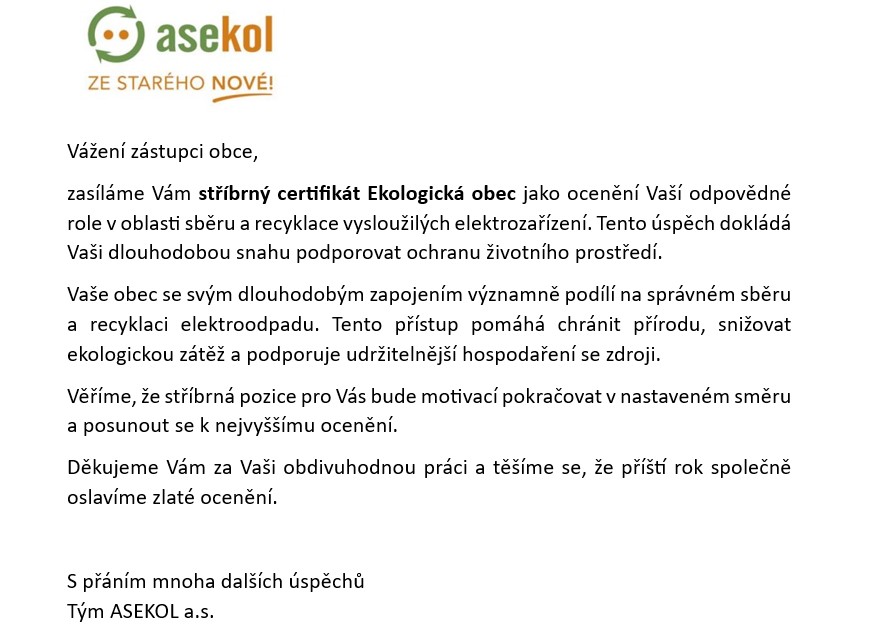 v těchto dnech naše obec získala od společnosti ASEKOL a.s. STŘÍBRNÝ CERTIFIKÁT za přínos v oblasti zpětného odběru elektrozařízení a ochrany životního prostředí ![]()