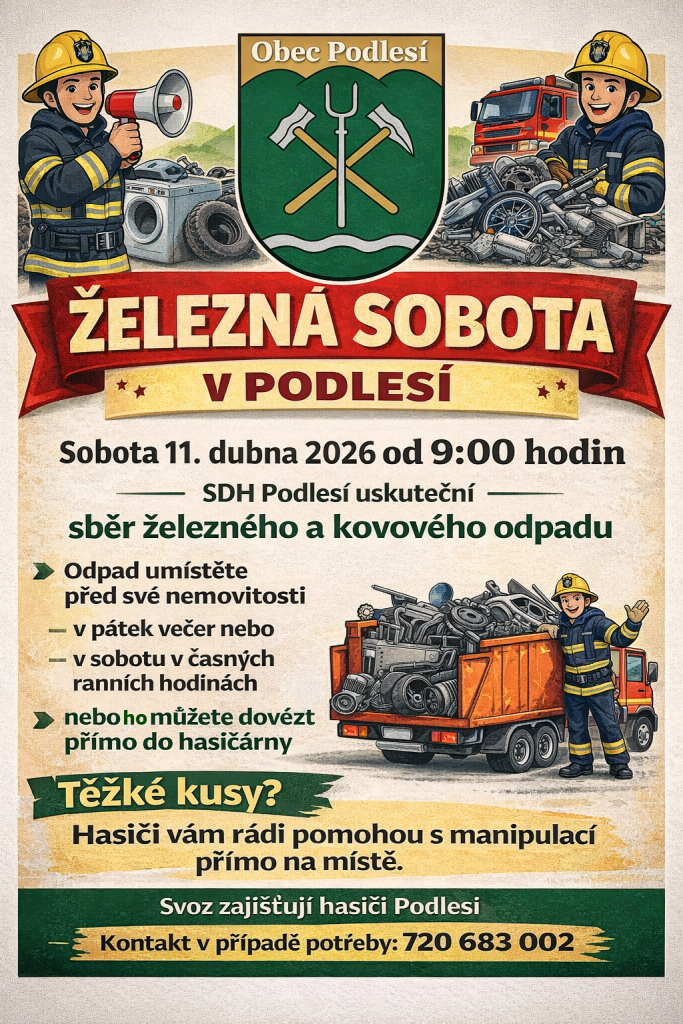 Obec Podlesí ve spolupráci se SDH Podlesí oznamuje, že v sobotu 11. dubna 2026 od 9:00 hodin proběhne sběr železného a kovového odpadu.